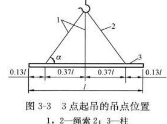 3、當(dāng)采用3個(gè)吊點(diǎn)時(shí),其中兩端的吊點(diǎn)距兩端的距離為0.13l,而中間吊點(diǎn)的位置應(yīng)在物體重心,如圖3-3所示。