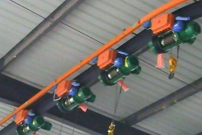 準(zhǔn)備工作就緒后便可以順利進(jìn)行吊重運(yùn)輸工作,鋼絲繩電動(dòng)葫蘆負(fù)責(zé)重物的起吊工作,工字鋼軌道負(fù)責(zé)為電動(dòng)葫蘆提供一個(gè)暢通無(wú)阻的運(yùn)行通道。